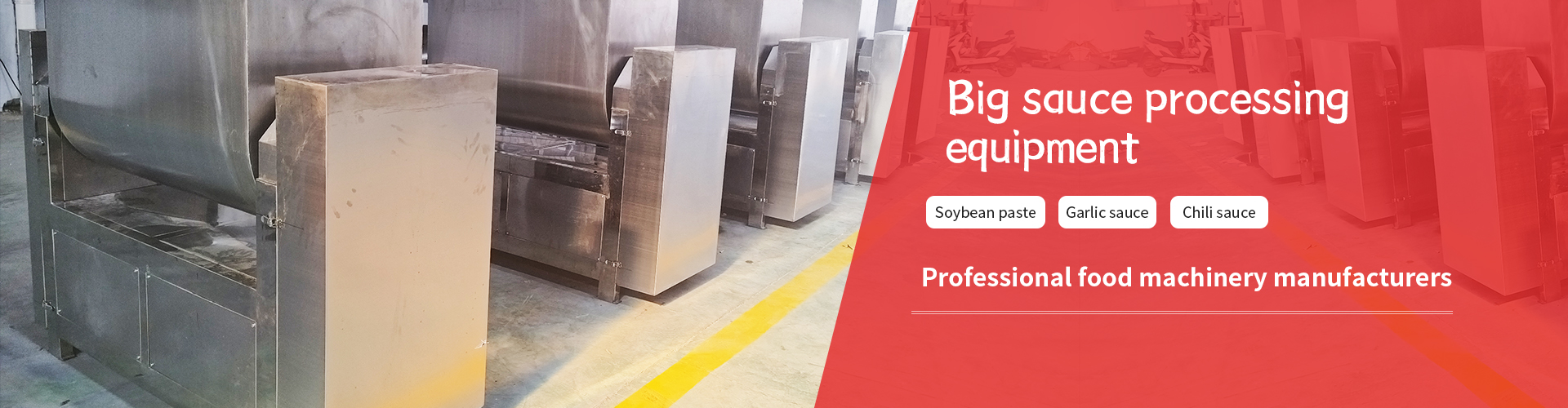 Big sauce equipment:Soybean grinder, soybean cooking tank, fermentation curve bed, big sauce extruder, planetary frying pan, sauce lifting machine, combination pour sauce pump, stainless steel storage tank, mixing system, packaging machinery
